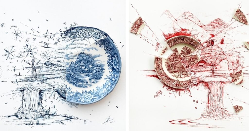 Strati started this work in 2020 after accidentally dropping and breaking a porcelain plate that belonged to his late mother-in-law. Rather than throwing it away, he devised a plan to restore the piece of dishware and give it an artistic touch. After placing the broken remnants on a piece of paper, he uses a pen to fill in the gaps, replicating the designs on the plate with his own meticulous ink drawings.