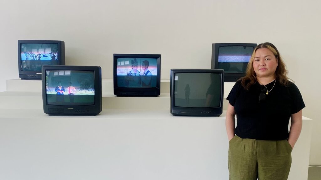 Artist Pao Houa Her stands in front of five chunky television sets from the ‘90s.