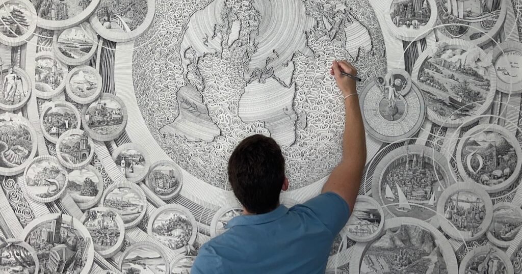 Many artists take inspiration from their travels, but Benjamin Sack found a unique way to make his way around the world. For the past decade, Sack has been an artist-in-residence on a Holland American cruise ship. This unique opportunity allows him to soak in architectural details from cities worldwide, which he then incorporates into his detailed pen drawings.