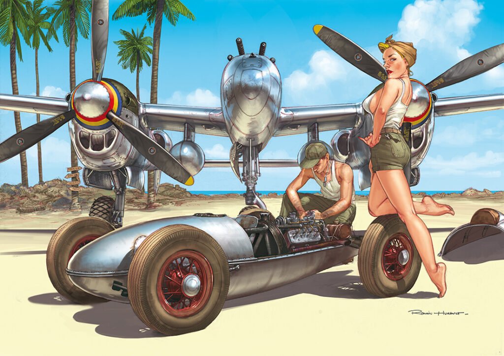 Romain Hugault developed a passion for aeronautics at a very young age, earning his pilot’s license at just seventeen. Faced with the choice of pursuing a career as a pilot and drawing as a hobby or becoming a designer and flying for pleasure, he chose the latter. After studying at the École Estienne, he went on to illustrate aviation reference books, including some for the French Air Force. His work largely focuses on aviation comics, particularly from the World War eras. Drawing inspiration from the pin-ups of that time, he authored several artbooks titled *Pin-Up Wings*. To date, he has sold over 800,000 prints.