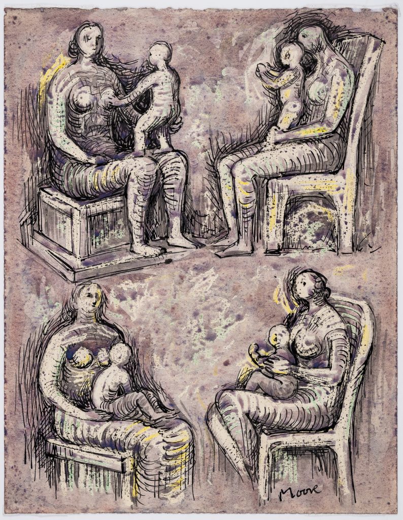 The drawing features the “Mother and Child Seated” motif, one of Moore’s favourites, and is dated circa 1947–49. The motif appears on both sides of the sheet, adding to its significance. The drawing uses ink, watercolour, and wax crayon, showcasing Moore’s characteristic artistic mix.