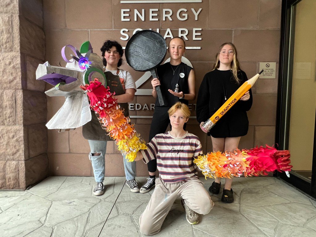 Young artists’ from PUGG (Pop Up Gallery Group), a youth work training program for the Department of Regional Art Workers, or D.R.A.W. creations for the DRAW-A-THON on Saturday, Aug. 12, 2023. The event took place outside of the D.R.A.W. studio at the Energy Square building at Cedar Street and Iwo Jima Lane in Midtown Kingston N.Y. Activities included immersive drawing activities, steamroller printing, face painting, and music. For more information, visit drawkingston.org. Pictured from left last week are DRAW-A-THON producer Maiszy Milliken, Spencer Fells, kneeling, Gia Boolukos with frying pan, and Elaina Mawhinney. (Tania Barricklo/Daily Freeman)