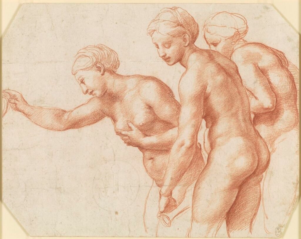 One of the show’s highlights is a drawing by Raphael called The Three Graces (circa 1517-18). In the study, the artist uses red chalk to draw a model in three different positions in preparation for his fresco of the Wedding Feast of Cupid and Psyche at the Villa Farnesina in Rome.