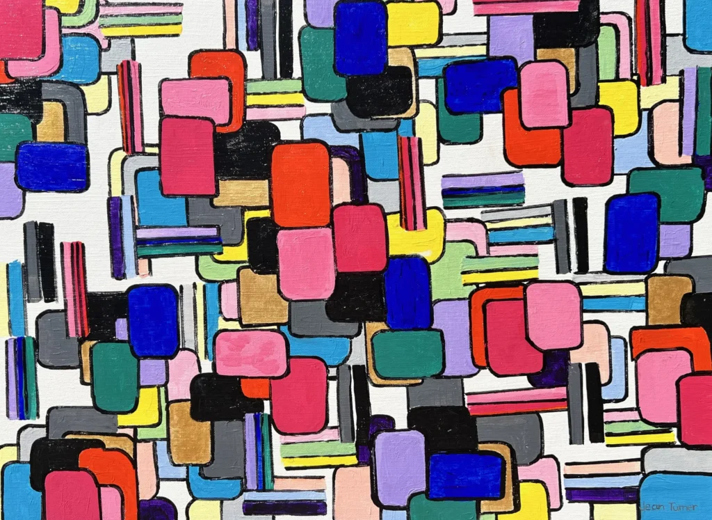 Other works in Kettle Art’s new gallery include a print called “Koi Journey” by Ikle, a vibrant work of abstract color and form called “Looking Down from Above” by Jean Turner, and an abstract geometric work called “Renewed by Green” by Myryn Elizabeth Clark.
