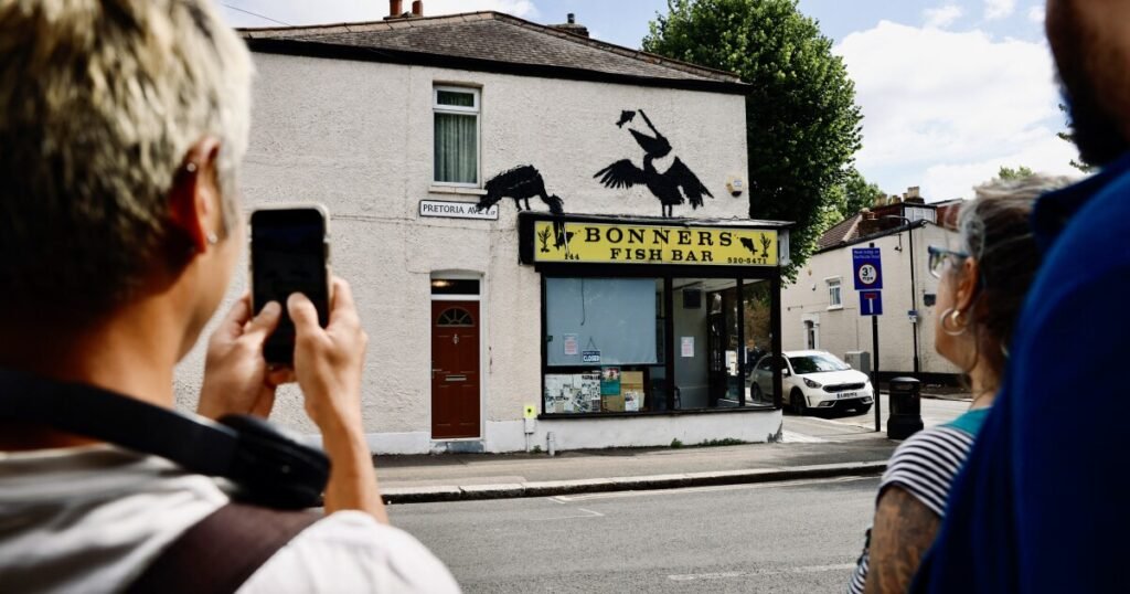 A week ago, in the northeast of London, a painted pair of pelicans were spotted perched above a fish-and-chips shop, as though wolfing down fish on the storefront’s signage. The next day, a cat adorned an abandoned billboard on a lonely stretch of road and then a glass police box in the heart of the city’s financial district was transformed overnight into a fish tank.