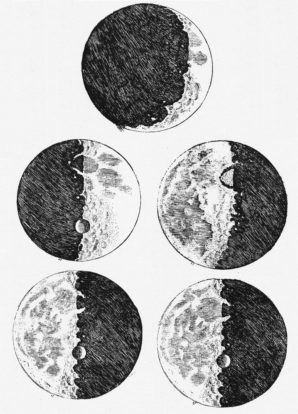 Galileo Galilei pioneered in 1609 the use of the telescope in observing the Universe, but he was also a talented artist trained in perspective and shadowing techniques pioneered by his fellow Italian artists. The telescope allowed him to discover the surface terrain of the Moon as well as the moons of Jupiter. Galileo sketched what he saw and tried to make sense of it. His pioneering depiction of the rugged lunar surface appears in the short astronomical treatise Sidereus Nuncius (Starry Messenger), which Galileo published in 1610.