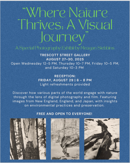 The Trescott Street Gallery in Taunton is set to showcase a new exhibit by student artist Meagan Stebbins. According to a community announcement, “Where Nature Thrives: A Visual Journey” will run from Aug. 27 through 30.