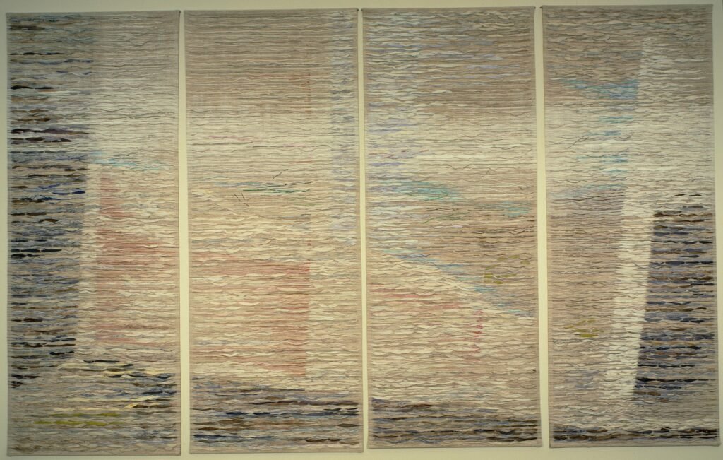 Entering the show, visitors will encounter Claire Zeisler’s “Coil Series III — A Celebration,” a cascade of white strands that turn blood red at the bottom, where they pile in a tangle. The piece is austerely minimalist, yet has a fleshy quality. Around the corner is Lenore Tawney’s “Box of Falling Stars,” a diaphanous rectangle drawn in space with dangling linen threads. The gossamer strands evoke a mist, defining the space while leaving it mostly open.