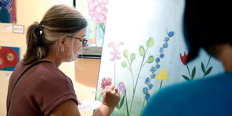 Jennifer Forbes adds to a community project led by artist Katie Stromlund as part of the Austin ArtWorks Center’s 10-year anniversary downstairs. Eric Johnson/photodesk@austindailyherald.com
