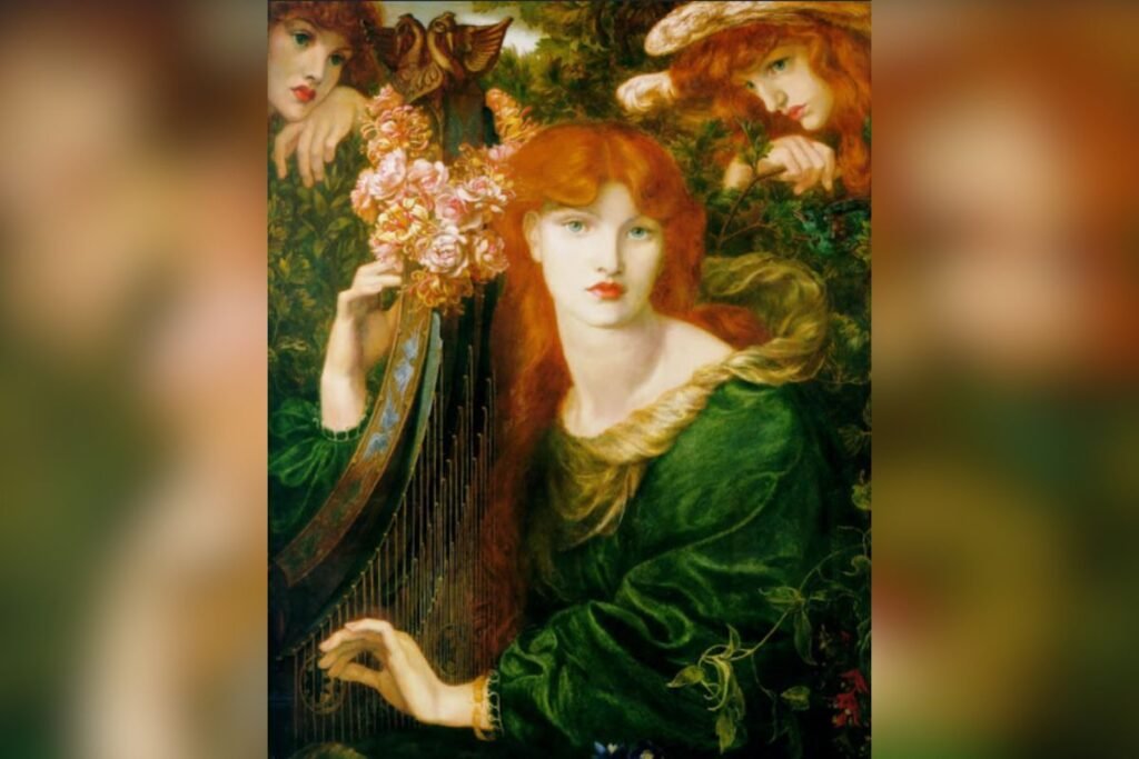 The 1873 oil on canvas depicts ‘the garlanded woman’ playing an arpanetta and looking directly at the viewer. The artist’s muse for the central figure was the actor and model, Alexa Wilding.
