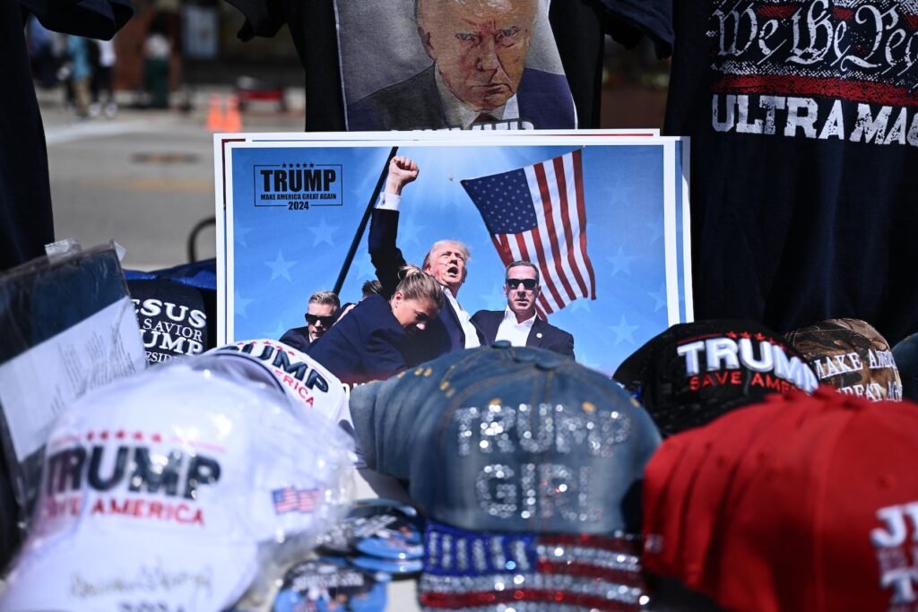 Merchandise supporting Donald Trump on display during the second day of the 2024 Republican National Convention at the Fiserv Forum in Milwaukee, Wisconsin, July 16, 2024. (Photo by Patrick T. Fallon / AFP)