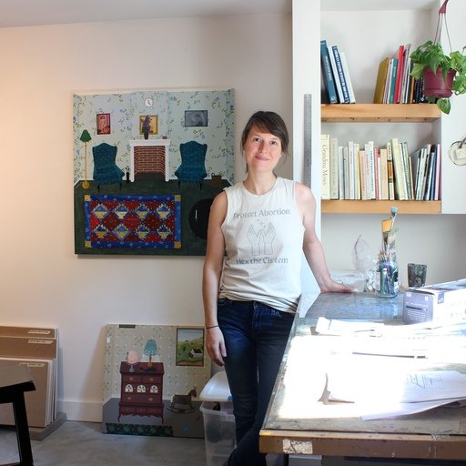 “There are three general themes that tend to guide my creative practice, she explains. “Creating intentional ambiguity, exploring female identity, and embracing contradictions. I locate the intersection of these themes by making narrative paintings that use mysterious figures and uncanny spaces to think about gender roles, the female body, and intimacy.”