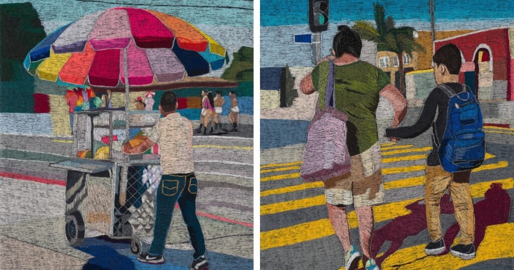 Erick Medel uses colorful thread to depict the daily routines of the latino community of Los Angeles’ Boyle Heights neighborhood.