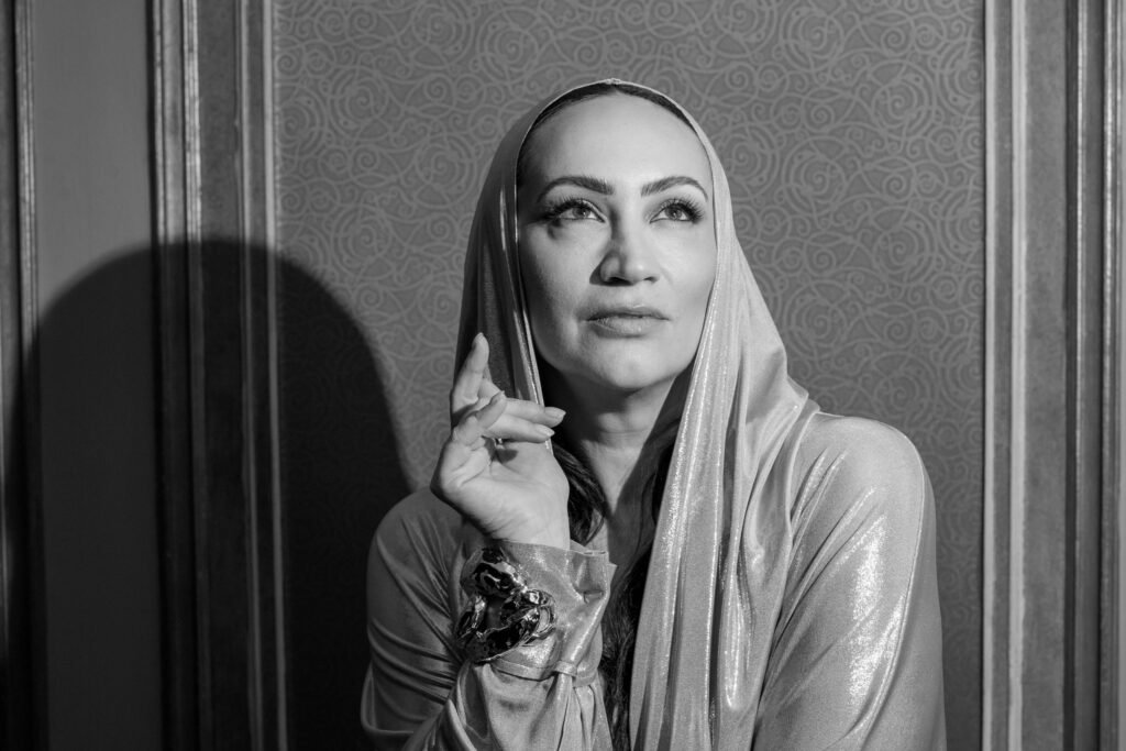 This is a black-and-white photograph of a woman dressed in a metallic-looking, shiny, silver hooded gown with a glamorous vibe. She is seen sitting down with crossed arms, exuding a sense of confidence and poise. Her posture and the direction of her gaze give the impression of a posed portrait.