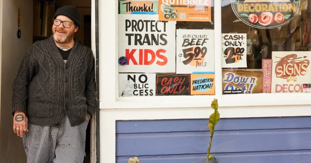 Like a sturdy little flower pot, the house practically blooms with Benzler’s creative output. The street-facing front window is a collage of his bright, graphic, hand-painted signs, whose topics range from the political (“Protect trans youth”) to the prosaic (“Ground beef $5.99”).