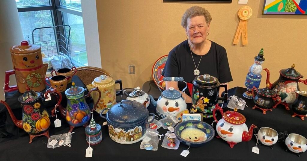 Tubbs never considered herself an artist and got started with it after a friend urged her to attend a class with her so she wouldn’t have to go alone. The friend soon quit class, but Tubbs continued. That was about 30 years ago. She got into painting teapots about 10 years ago. She learned through taking local classes and would attend national conventions to hone her skills.