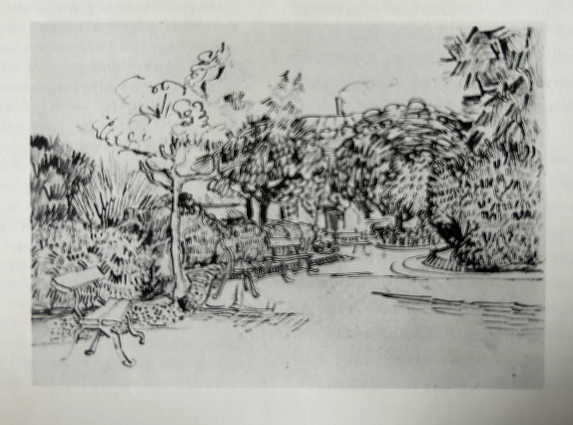 The sketch shows the public garden in Place Lamartine, just outside the Yellow House in Arles. The house was Van Gogh’s home from September 1888 to March 1889, his fellow artist Paul Gauguin staying with him there for two months .