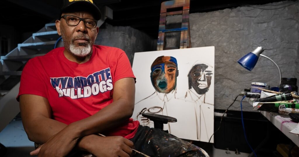 On a recent August morning, the artist Harold Smith was starting on his first painting of the day in his home studio, just off State Avenue in Kansas City, Kansas. He picked up a brush full of metallic pearl-tinted paint and started mixing it on his palette.