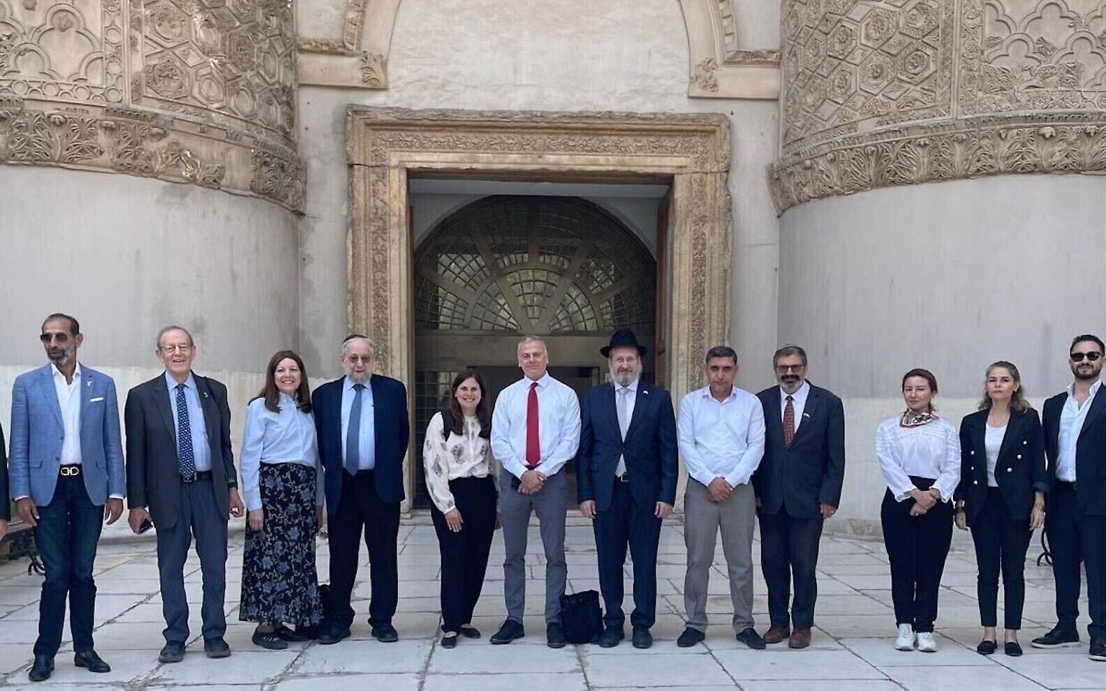 A group of Jewish scholars and leaders, with representatives from the National Museum of Damascus, outside the museum on Sept. 16, 2025. (Courtesy Asher Lopatin via JTA)
