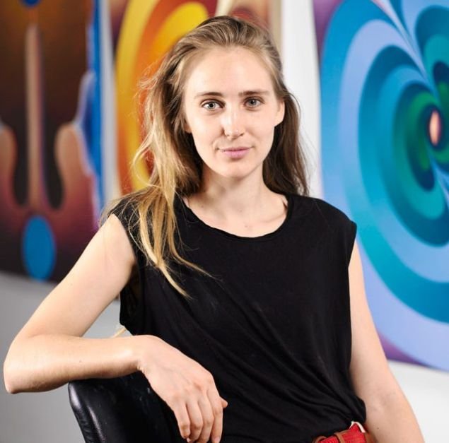 A blonde woman wearing a black tank top rests on her elbow in front of a wall of colorful paintings