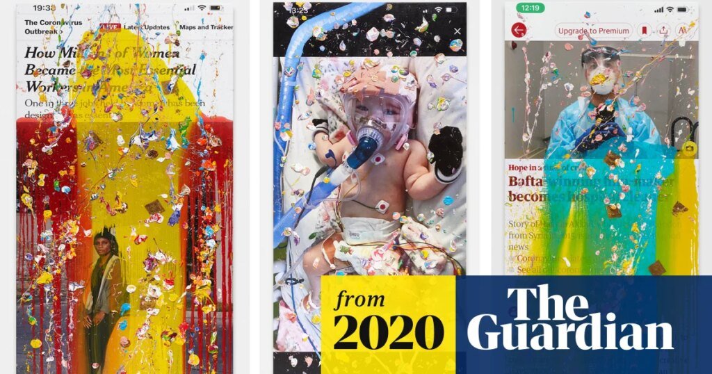 His “viral paintings”, seen here for the first time, are phone screenshots of news stories – from outlets including the Guardian – printed on enormous canvases, over which Quinn pours and splashes oil paint.