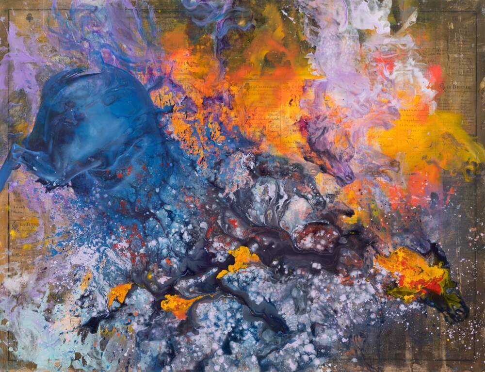 My favorite painting in the new Firelei Báez exhibition at the Institute of Contemporary Art in Boston is the one with the horses — mainly because it doesn’t appear to involve horses at all. An abstract whirl of color splashes across the bottom of the canvas like crashing waves and bursts toward the top of the painting like fire. But study the image for more than a moment and shapes begin to appear: the large haunches of a charging horse bloom on the left, while on the right, its elegant snout emerges like a shadow from behind a splash of gold.