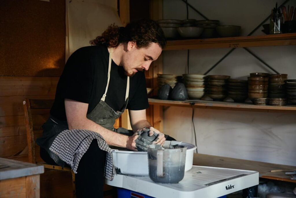 Ceramicist Danny Aitken creates wheel-thrown ceramic vessels and urns that are inspired by, and incorporate elements of, prehistoric art from the European Mesolithic and Neolithic period. His work is very distinctive and has an ancient authenticity about it – they look like pieces you might see in the British Museum. Aitken completed an MA in Material Culture and Experimental Archaeology at the University of York in 2024 which informs his work. “Taking inspiration from prehistoric archaeology is fun and I find it fascinating and liberating, it is a real privilege to be able to do it,” he says. “I have always been interested in the human drive to create and to conceptualize in an artistic way. That period was when humans really started to engage in creative expression.” During the open weekends Aitken will be showcasing around a dozen of his larger vessels and around urns and smaller pieces such as candlesticks and incense burners. Most of his works are fired with ash glazes that he makes himself, composed of locally sourced materials. “The Open Studios seems like a really nice community,” he says. “I’m really looking forward to the weekends and being part of the event. It feels like a bit of a rite of passage.”