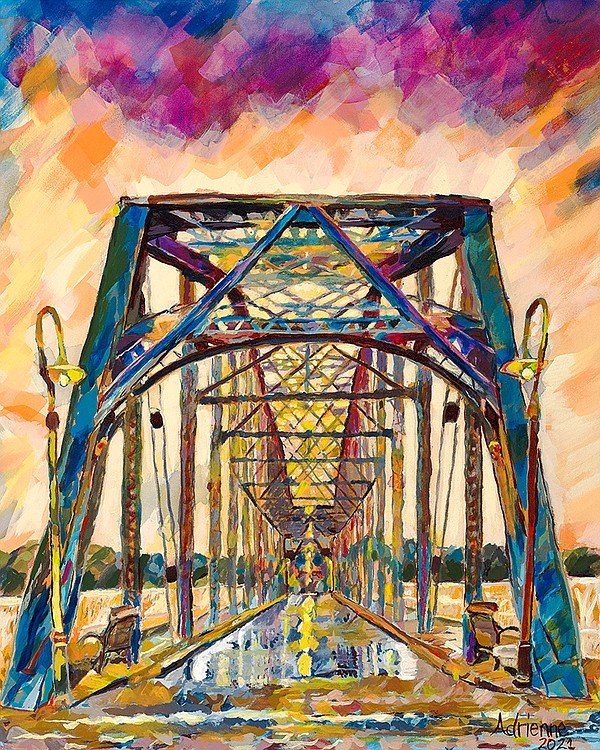 A Chattanooga native, she finds beauty in the Walnut Street Bridge and knew that she wanted to portray it in her artwork. Powell often paints from photographs, and this painting was based on a photo of the walking bridge at dawn. The colorful background shows the sunrise. She says she likes to capture different perspectives and moments.