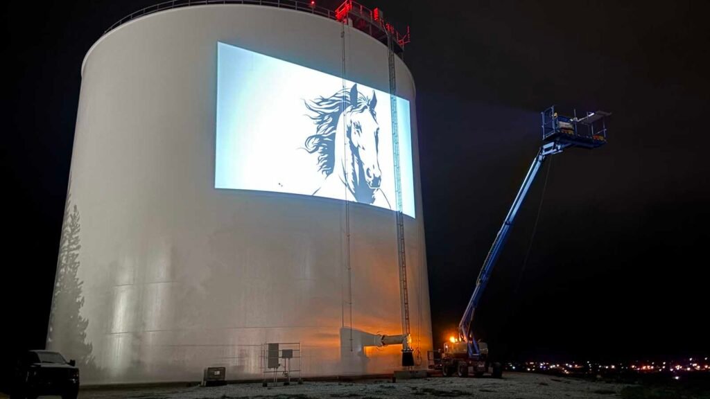 “I kind of get there at sunset and I put the projector up on a lift, and I stick it out in the air pretty far,” he said. “And, even still, it’s a big enough water tank that I have to do it in sections.”