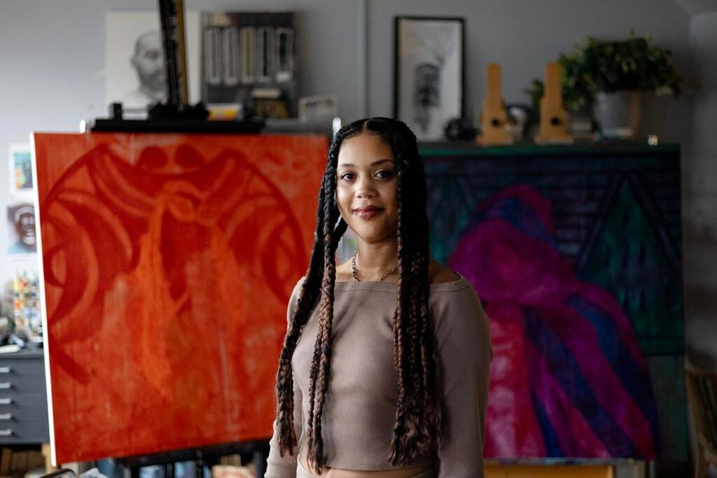 Outside the studio, she is known for her leadership at Public Functionary, a gallery celebrating the work of artists from marginalized communities; as an art professor at the University of Minnesota; and for her activism with Creatives After Curfew, a muralist collective formed in the wake of George Floyd’s murder.