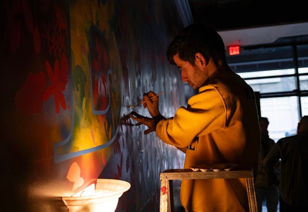 He is still working on a mural at Bitter Blossom, 1707 Maple St. He paints it at night, at the same time he is DJ-ing at the bar.