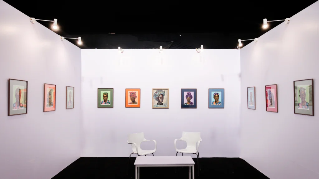 Established in 2021, the Lagos-based gallery made its debut at the fair this year presenting the work of U.K.-based Nigerian artist Victoria Oniosun, Lagos-based Nigerian artist Damilola Moses Opedun and Zimbabwean artist Shalom Kufakwatenzi. Another gallery that debuted at the fair in the Spotlight section is the Lagos-based Adegbola Gallery, which opened its doors in October. The gallery presented a solo booth of portraits of Sakara musicians and their patrons by Ibadan-born Nigerian painter and draftsman Adewale Kolawale John.