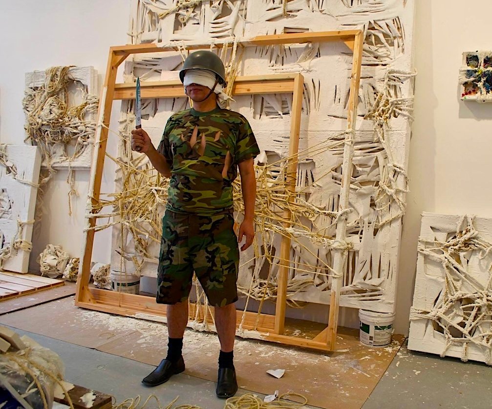 BY STEPHEN DiLAURO | Anyone wandering into a gallery where artist Jon Tsoi is performing could feel baffled watching him attack a canvas with a rock or a knife while blindfolded.