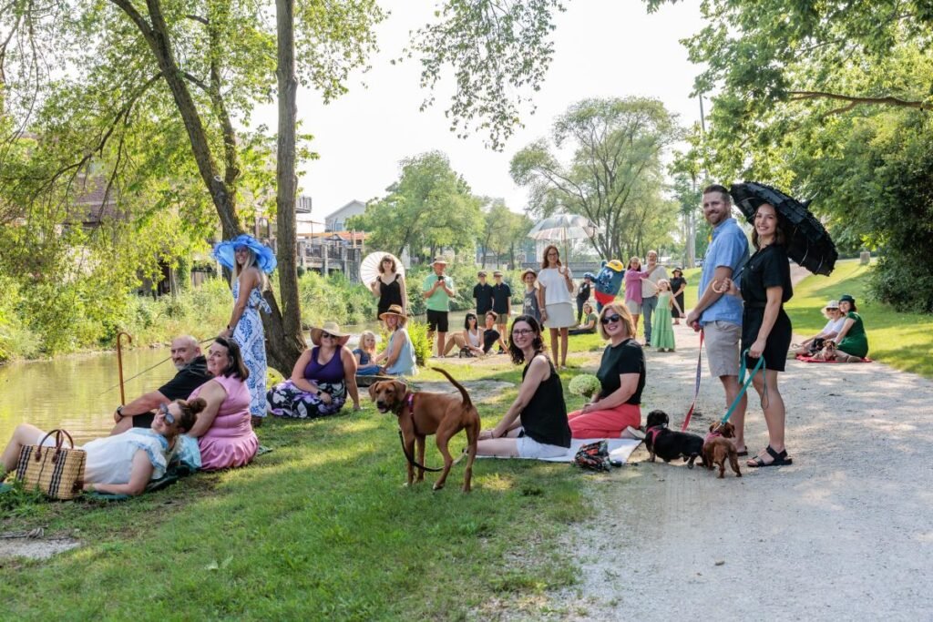 In the town’s most recent quarterly postcard, community members gather near the l&m canal to imitate George Seurat’s painting, A Sunday on La Grande.