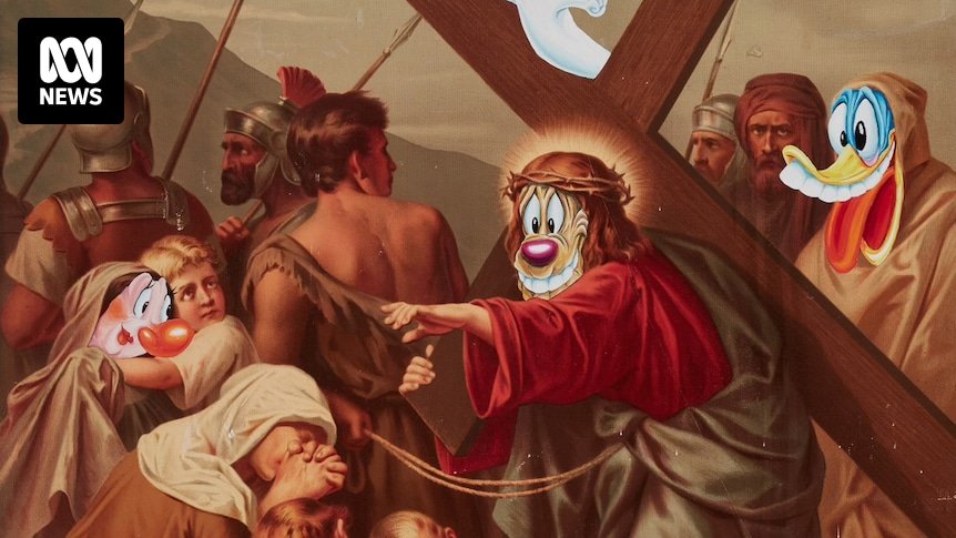Over the next few years, each of the framed prints would receive the signature Philjames treatment: Jesus falls the second time was a finalist in the 2018 Sulman Prize, and five of the works were chosen as part of the National Art School’s Caught Stealing exhibition in 2019, which showcased artists who “mobilise theft as an artistic strategy in their work”, including Daniel Boyd and Soda Jerk.