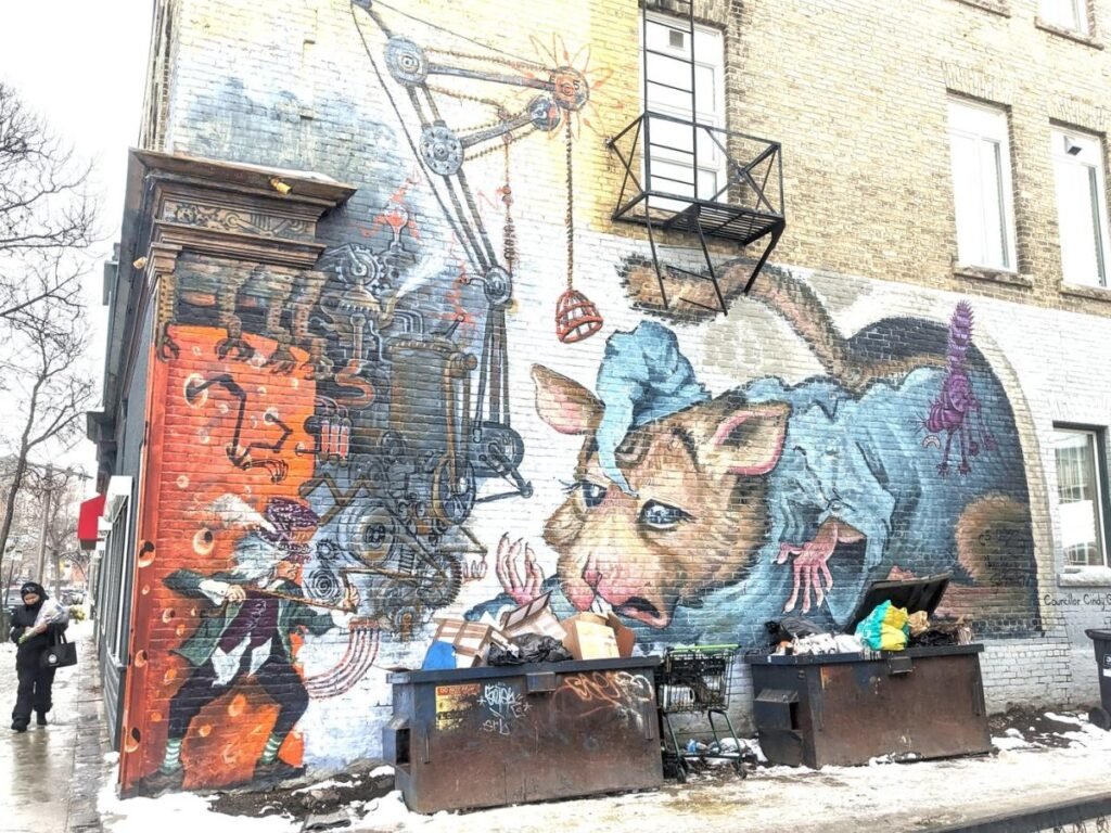 “A Better Mousetrap,” the mural on Sargent Ave is the second mural of a three part series of his ‘Wonderland’ theme. Sponsored by West End city councillor Cindy Gilroy and West End Biz, he spent four Saturdays in a row, painting and chatting with those stopping to watch.