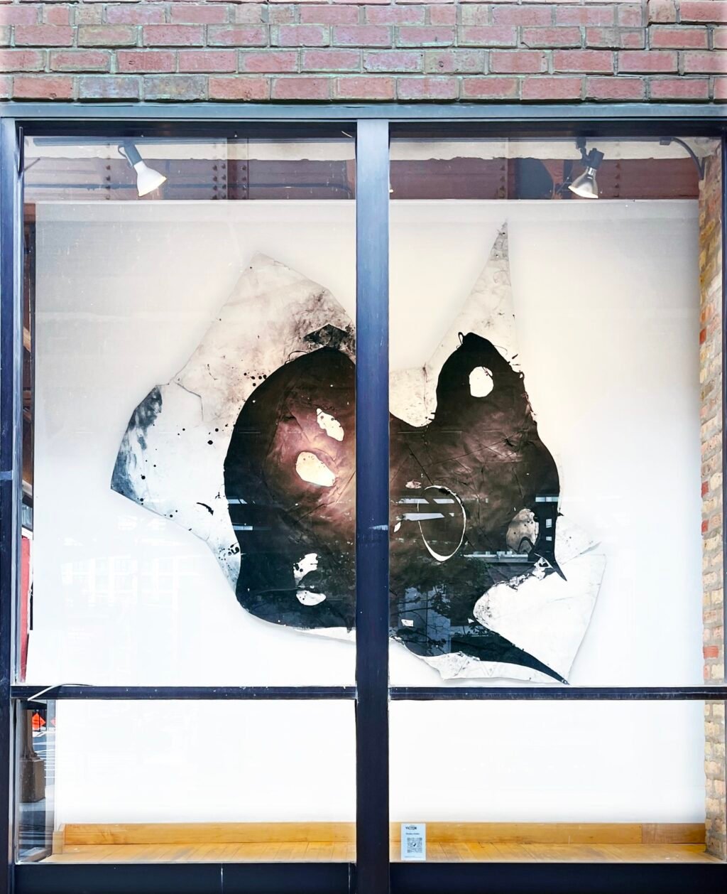 Of the works up at Gallery Victor, “Drawing,” is the most familiar, a black and white piece that Kimler pours with graphite or charcoal to cover the seams. It’s dubbed a drawing because of his gestural, figurative technique that mimics the act of drawing. The black, organic, rounded shape pairs well with the sharper, defined points of the paper background.