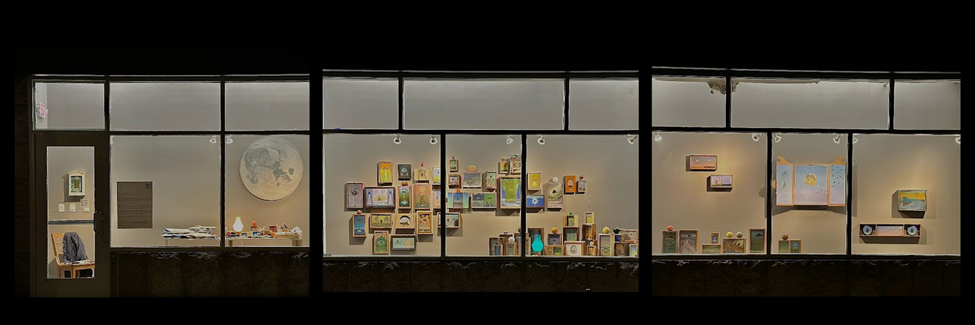 The immediately visible moon painting opens up the story: a studio space, the natural habitat where ideas come into form. On the cluttered desk, sketchbooks lay open, tools and paint are in use, headphones set aside, and the lamp emanates extra light. To Angell, this studio is a “fake” one, though made up of his personal items; the props are carefully arranged to evoke safe, warm, and comfy sensibilities, as one steps in and out of the space to resume the alternative identity as an artist. The sketchbooks show watercolor drawings, a quick sketch of the triptych shown in the last window, and texts captured from the music Angell listens to while working at the studio. Further including a personal touch to this temporal studio installation, Angell’s studio playlist is shared via a QR code in the exhibition for viewers to explore.