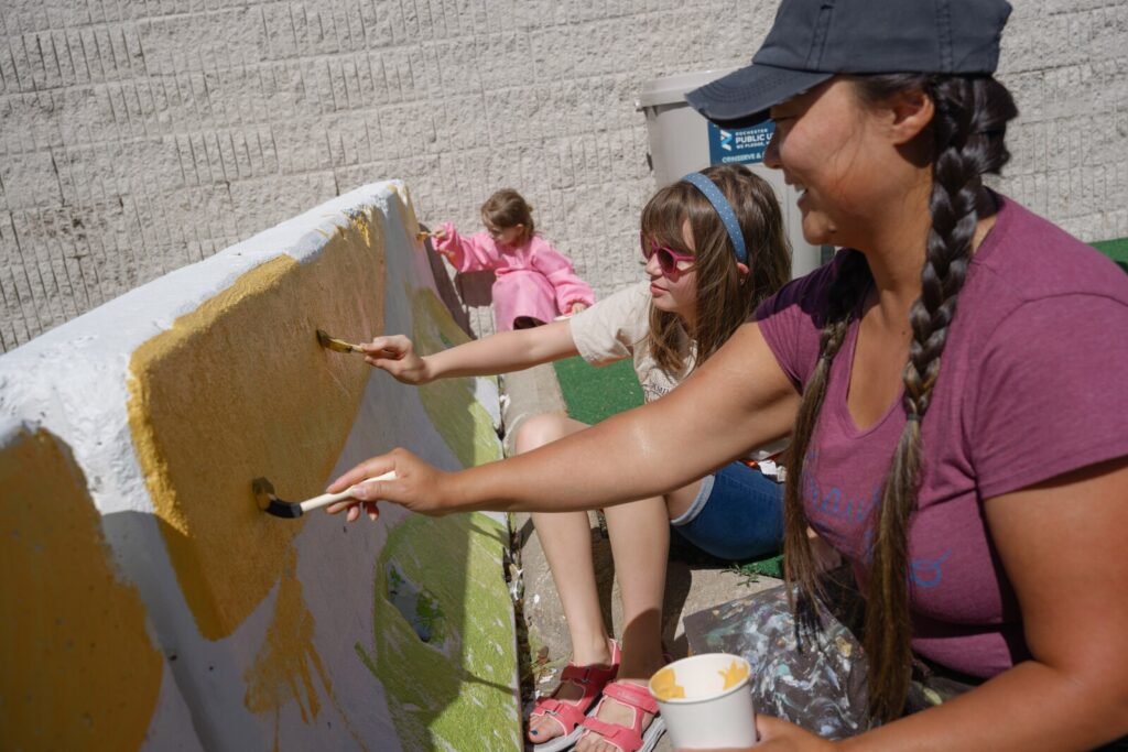 Jazmyn Jakobson looks on as her daughter, Lilith Jakobson, 3, helps paint a mural during a barricade-painting event with artist Amy Krause on Wednesday, June 5, 2024, in Rochester. Krause will be at SPARK from 10 a.m. to 11 a.m. Thursday and Friday working with children on the mural as well.