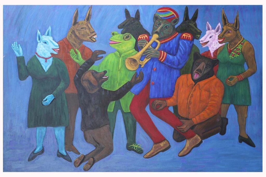 In Homer’s Iliad, the Myrmidons were the tribe of warriors commanded by Achilles. The charisma and God-like status of their leader meant that they are now associated with the idea of ‘blind following’. In Kaul’s painting, we see a Pied Piper-like figure with an animal-head leading a group of man-sheep hybrids into violence, their blades raised aloft in anticipation of bloodshed.
