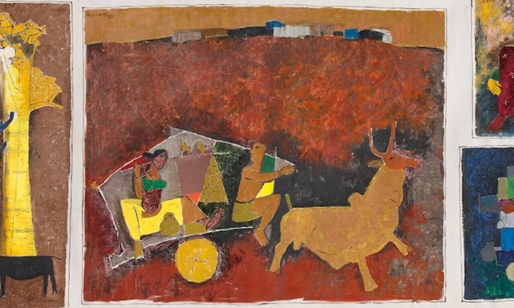 A mural-sized work comprised of 13 panels, it is “the most significant work by Husain to come to the public market in a generation”, Avari says. The 1950s are Husain’s most valuable decade and the previous secondary market record-holder for the artist, the Untitled (Reincarnation) that sold for $3.2m last September, dates from 1957. During these years Husain travelled extensively around both India and the world, and the various panels of Untitled (Gram Yatra), each a separate vignette, detail a wealth of global influences, from Paul Klee and Pablo Picasso to Chinese calligraphy. The work’s unofficial title in Hindi, “Gram Yatra”, means village pilgrimage and it depicts quotidian scenes of pastoral and rural life across the country as Husain sought to capture the reality of India in the years following its independence.