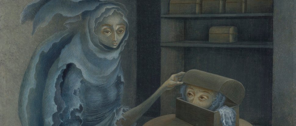 Encounter reflects a popular theme in Surrealist work. “The concept of the encounter – especially the chance encounter – was a subject favoured by the Surrealists for its mysterious potential,” Scott continues. “In this striking composition, a seated figure carefully lifts the lid on a tiny casket to find her own eyes staring back at her. Several similar boxes sit on the shelves in the background, suggesting that there are more ‘selves’ to be discovered. Many of the figures that Varo painted resemble the artist herself, and this work is believed to be a self-portrait.”