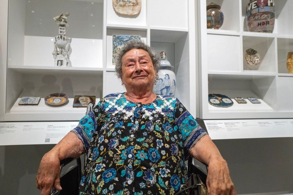 Magdalena Suarez Frimkess smiles during a preview of her exhibit, Magdalena Suarez Frimkess: The Finest Disregard, at the Los Angeles County Museum of Art in Los Angeles on Wednesday, Aug. 14, 2024. The exhibit is the first museum exhibition of L.A.-based and Venezuelan-born artist Magdalena Suarez Frimkess. Trained in painting, print- making, and sculpture in Venezuela, Chile, and New York, Suarez Frimkess’ most recognized works are made in clay. (Photo by Hans Gutknecht, Los Angeles Daily News/SCNG)