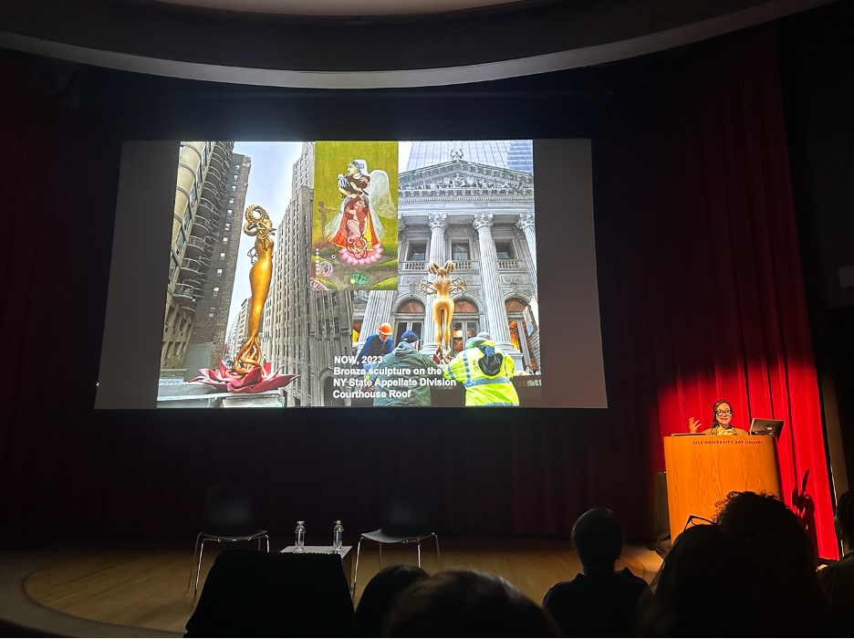 During her talk, Sikander explained how “Witness” was, indeed, a nod to Justice Ruth Bader Ginsburg, as well as previous female Supreme Court Justices. She pointed out the lace collar on the sculpture as a reference to the accessories Ginsburg and Sandra Day O’Connor — the first female Supreme Court Justice — had added to the traditional black judicial robe.