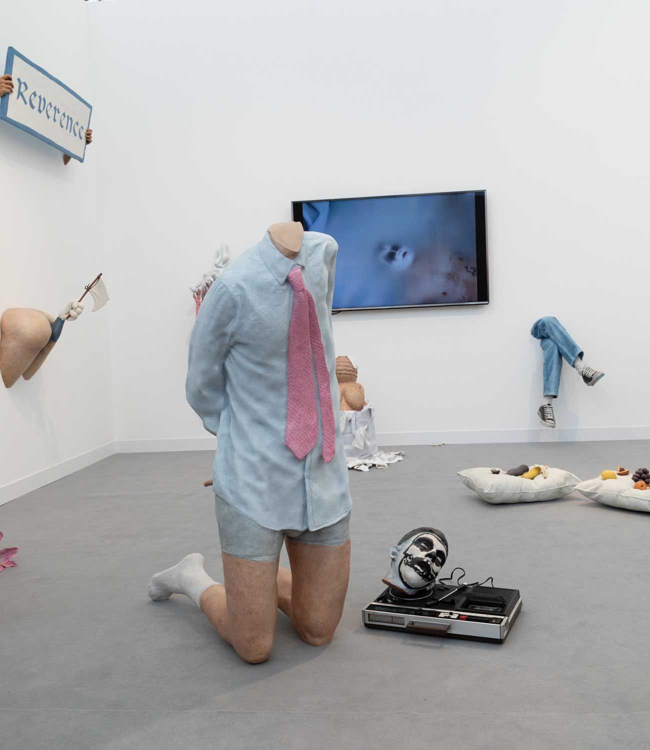 The core of López Llamas’s booth is a video on the wall, in which coming-of-age stories evoke imagery from music videos (Michael Jackson) and art (Charles Ray’s Plank Piece performance photographs). Dotted around are sculptures cast in plastic and then hand-painted. Polyphonic cultural references abound: Count von Count from Sesame Street is translated into a Day of the Dead character, Dürer’s Praying Hands appear amid a spider’s web, the Venus of Willendorf sits amid a bag of old socks, while a Mickey Mouse hand emerges from a naked bottom on the wall. It is a tableau of hallucinatory images: where do we come from and what do we add up to?