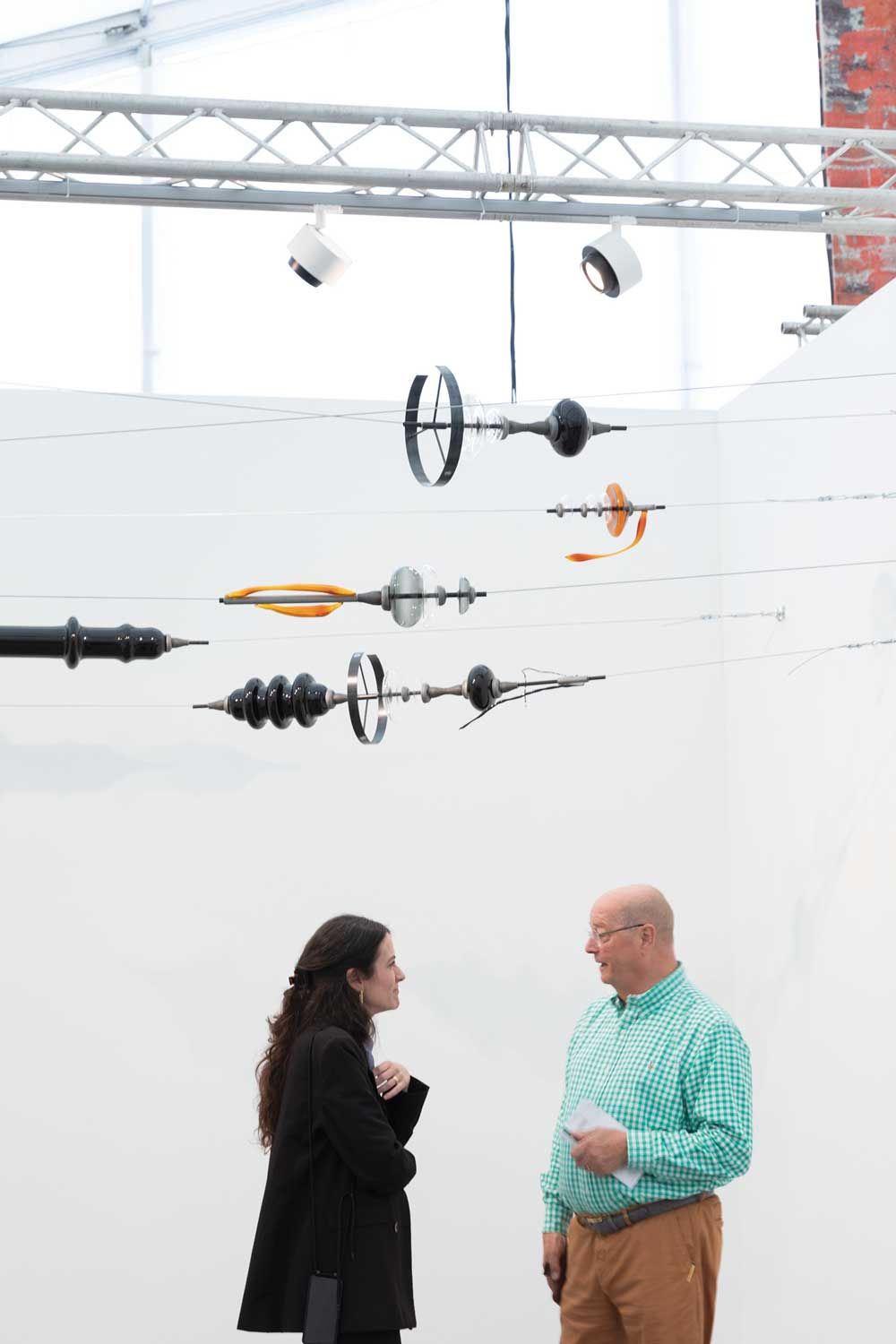 Six cables stretch across this booth, with forms resembling the glass and ceramic insulators found on electricity pylons. They contain various substances including tar and alcohol. A certain precarity is suggested by these fragile, liquid-filled forms hovering over our heads, especially because they have developed organic protuberances—growths that reflect Lara Fluxà’s interest in environmental catastrophe. But alongside the hazards of the Barcelona-based artist’s sculptures are material and aesthetic delights, in the delicacy of the crafting of the glass forms, and in the beauty of the shadows they cast, like spectral drawings on the booth’s white walls.