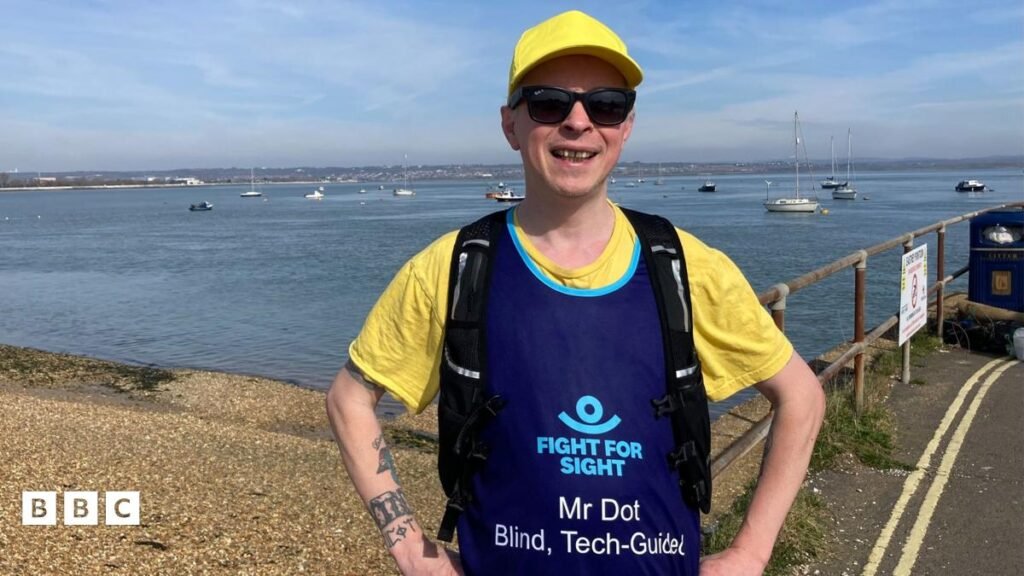 A blind artist is taking on a world-first challenge to run a marathon guided by volunteers using artificial intelligence tech.