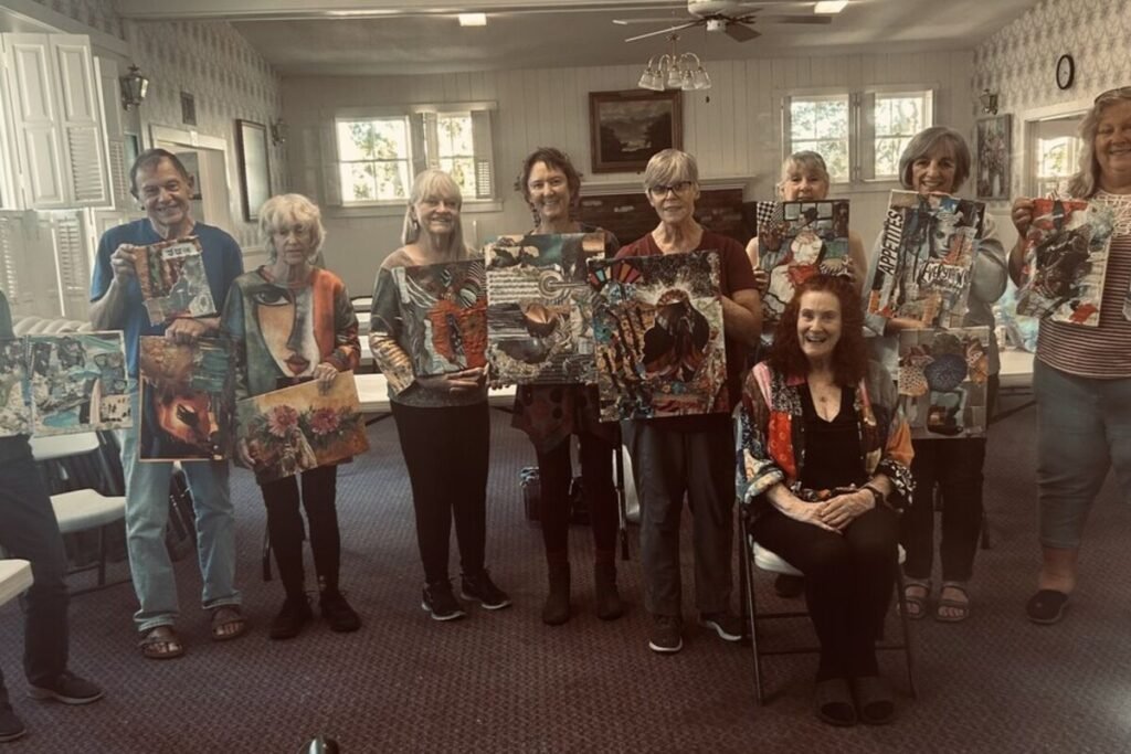 Fallbrook Artists Association artist Karen Langer Baker, at front, who demonstrated collage artwork techniques at the May meeting of the Fallbrook Women’s Club, poses with nine of the 10 participants and their completed pieces, some of which were created on thrift store-purchased paintings on canvases.