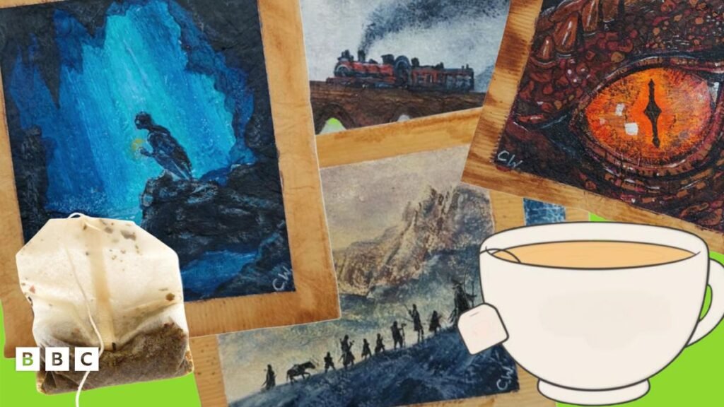 In her Harry Potter art, she has recreated the Hogwarts Express and the grand spectacle of Hogwarts itself. The Lord of the Rings artwork depicts Gollum, a dragon’s eye, and even characters such a Gandalf and the hobbits trekking up a mountain. Tea-rrific!