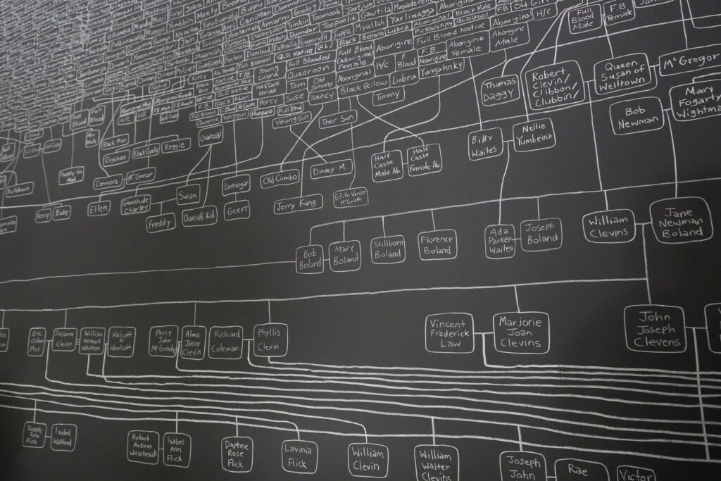 Moore’s presentation for the Australia pavilion, titled kith and kin (2024) and curated by Ellie Buttrose, uses the structure’s dark exterior as a springboard for the inside. On black walls, Moore spent months and used countless sticks of white chalk to write the identities of over 2,000 generations of his family lineage spanning 65,000 years in an enormous chart. Moore drew the contemporary generations at eye-level in a more recognizable family tree format, but the chart quickly starts to look like a brick wall or shingled roof as the boxes of names and identity markers are squashed against each other with each continuing level up to the ceiling.